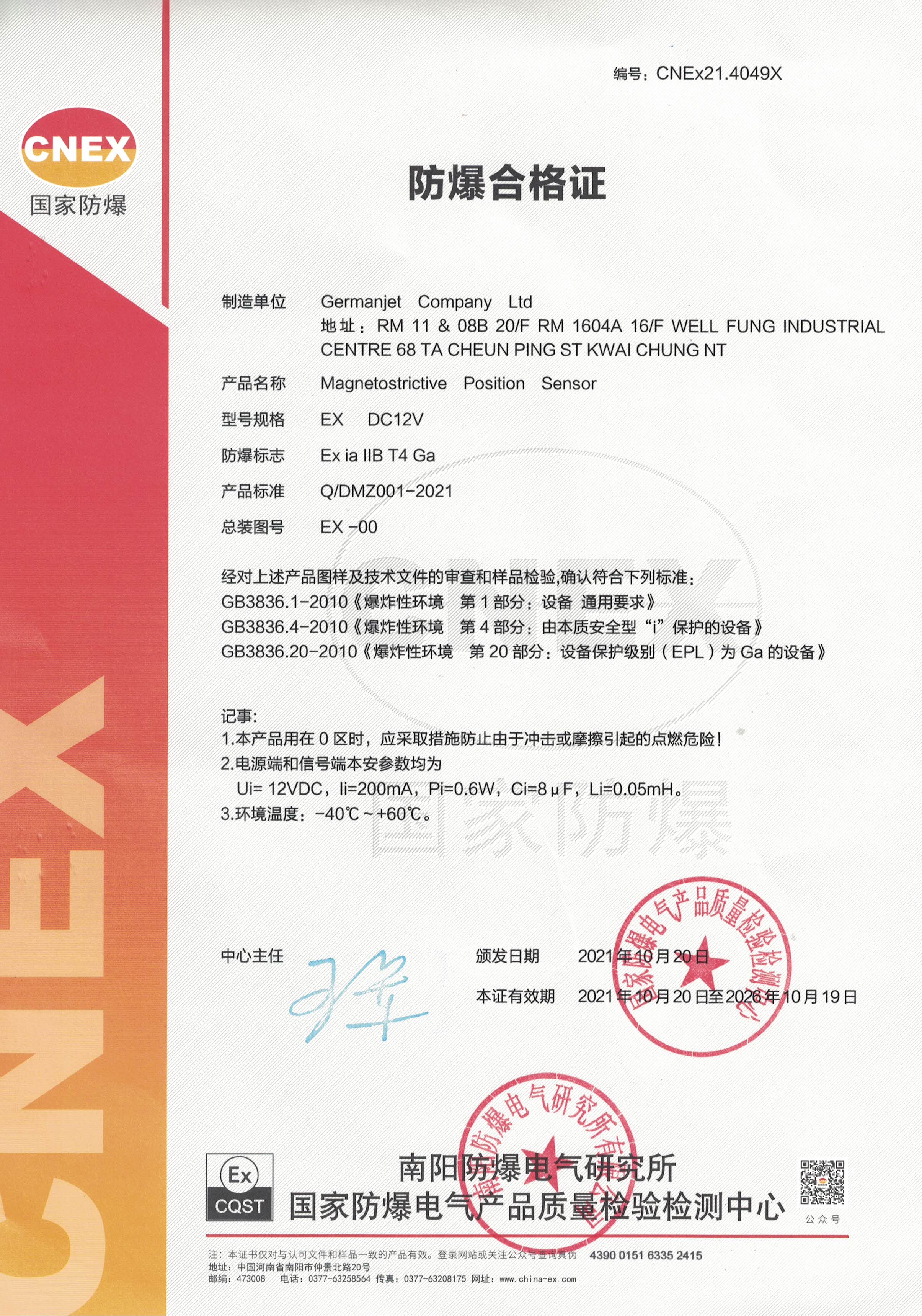 德敏哲1 7 EX系列防爆型磁懸浮位移傳感器是嚴(yán)格按照國(guó)家防爆 電氣產(chǎn)品質(zhì)扯監(jiān)督檢驗(yàn)中心G B 3 8 3 6 . 1 - 2 1 0 0《爆炸性環(huán)境用 第1部 分: 設(shè)備通用 要求 》、G B 3 8 3 6 . 4 -2 0 1 0《爆炸性環(huán)境 第4部分 :由本質(zhì) 安全型 "i" 保護(hù)的設(shè)備 》的要求研制 、設(shè)計(jì)、 制造 。 還獲得國(guó)家防爆 電氣產(chǎn)品質(zhì)扯監(jiān)督檢驗(yàn)中心頒發(fā)的防爆合格證